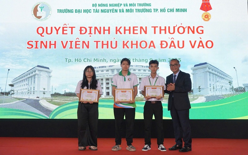Một điểm nhấn tại Lễ khai giảng năm nay là phần vinh danh thủ khoa và á khoa đầu vào. Trong đó, Nguyễn Đoàn Phương Như (ngành Quản trị kinh doanh) đã xuất sắc trở thành thủ khoa khóa 2025; Phan Thị Ngọc Thanh (ngành Quản lý đất đai) và Trịnh Minh Tỉnh (ngành Khí tượng – Khí hậu học) là á khoa.