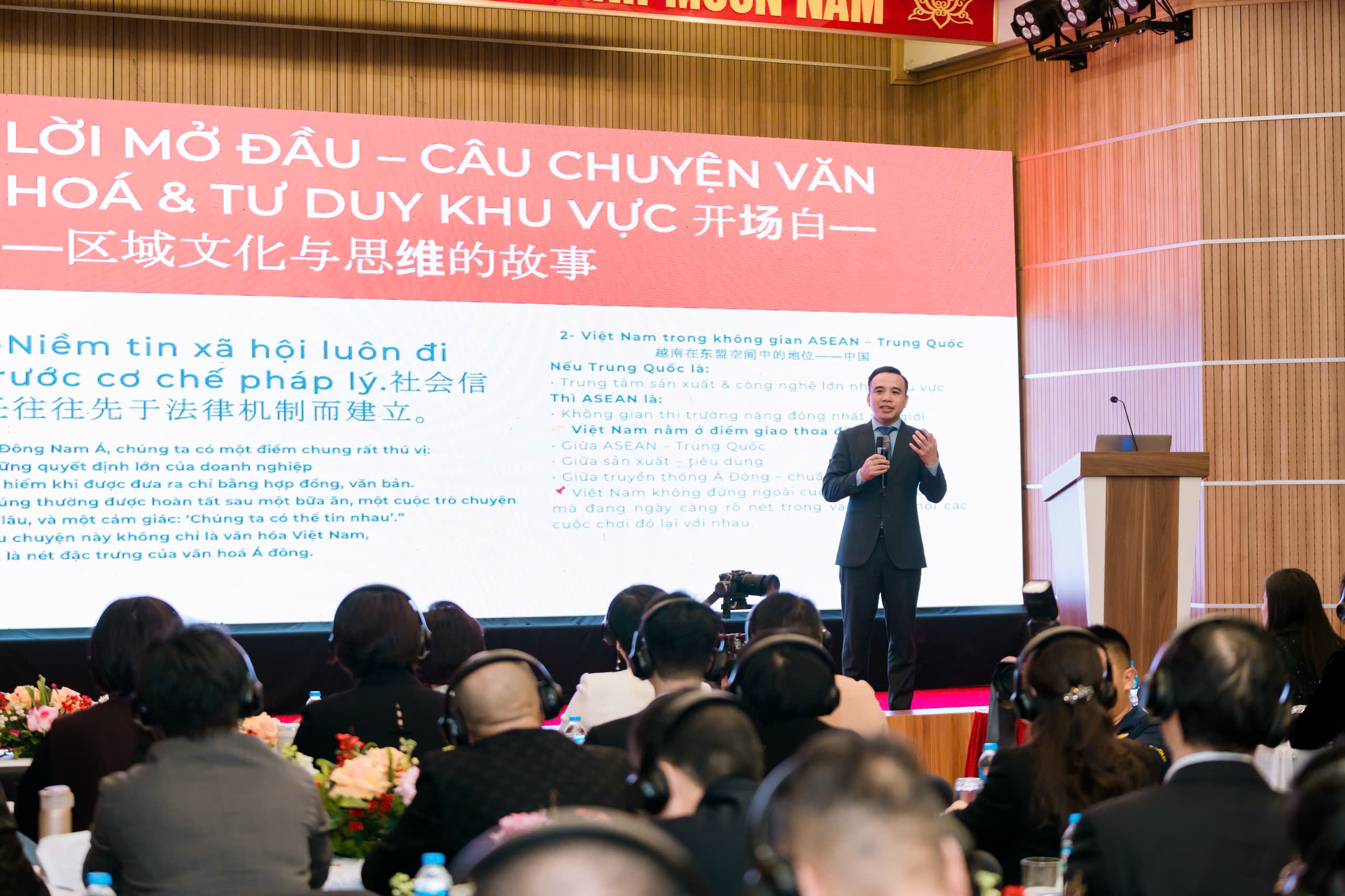 Trong phần trình bày, ông Vũ Đình Thao đặc biệt phân tích sâu sắc những nét đặc trưng của văn hóa kinh doanh tại Việt Nam, nhấn mạnh các giá trị cốt lõi như tính linh hoạt, tinh thần hợp tác, sự coi trọng uy tín và mối quan hệ lâu dài, qua đó giúp các doanh nghiệp quốc tế hiểu rõ hơn về môi trường kinh doanh bản địa. Những chia sẻ này được đánh giá cao khi định hướng chiến lược đầu tư bền vững, lâu dài cho các doanh nghiệp ASEAN và Trung Quốc khi tiếp cận thị trường Việt Nam.